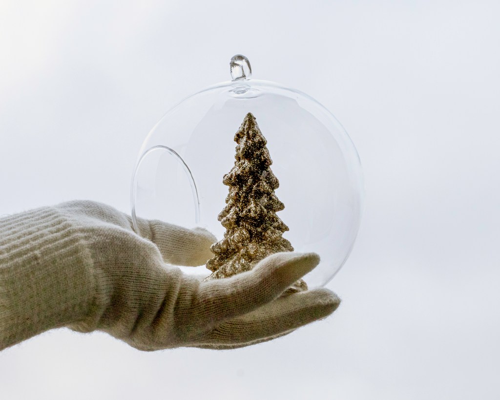 Lumisadepallon etsintä veti kuitenkin vesiperän. Niitä toki löytyi kaupoista, mutta palloissa olleet maailmat eivät sopineet ajatukseeni tai olivat muuten vaan kökköjä. Oli rakennettava pallo itse. Kuvasin “Talvimaa”-pallon koristekuusi sisällään parvekkeellani jotta lasin pinnoilla olisi aitoa valoa. Sisällä oleva luminen maisema on kuvattu Viikissä jokunen vuosi sitten. Pensselöin kolmesta kuvasta koostuvan kokonaisuuden kasaan ja lisäilin vielä mukaan vähän taikaa taivaalle ja värejä lehtiin, lunta etc. kunnes Talvimaa oli valmis.